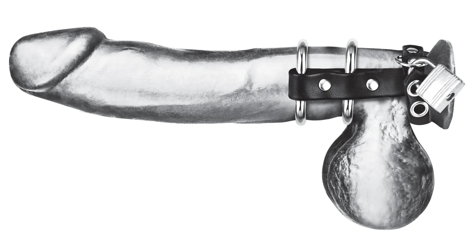 Deux anneaux pour dominer les testicules ! L’anneau pénien double en métal avec sangle de verrouillage pour testicules force l’érection tout en maintenant le pénis emprisonné et les testicules sous contrôle. Parfait pour le CBT, cet accessoire restreint la circulation sanguine grâce à deux anneaux métalliques en forme de O faisant office d’anneaux péniens et une sangle en cuir sécurisée par un cadenas et une clé. Orné d’œillets pour une esthétique BDSM classique, cet outil saura soumettre même les plus insolents.