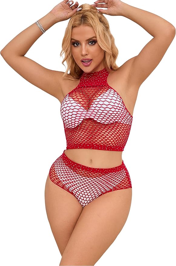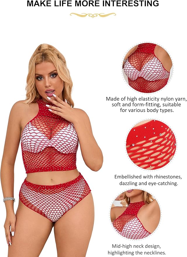 • Ensemble de lingerie en résille pour femme : l’ensemble de lingerie en résille sans manches comprend un haut court à col roulé et une culotte taille haute assortie, garnie de strass accrocheurs sur tout le corps, il peut mettre en valeur vos courbes parfaitement et attirer les regards.