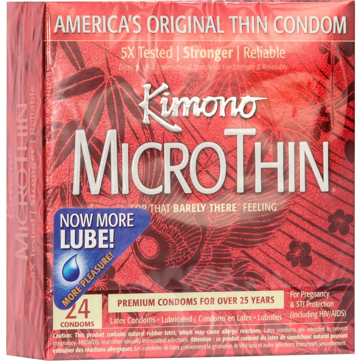 - Box of 24 condoms Our best seller, best rated, and thinnest condom ever! 5X Tested, Stronger, Reliable Kimono MicroThin condom is consistently rated the best thin condom in condom reviews, and the favorite thin condom among users. The combination of Japanese engineering, premium natural latex, and a proprietary formula allows us to create a very thin condom that ranks among the thinnest condoms available today. Kimono MicroThin condoms are 5X tested, and not only meet, but exceed US and International Standards for strength and reliability. Smooth latex, sheer thinness, and strength make Kimono MicroThin the best thin condom. – Best rated condom for thinness – Made with premium natural latex – Paraben and glycerin free – Low latex condom smell – Vegan friendly, no milk/animal protein – Kimono condoms exceed US & International Standards for strength and reliability – Top rated condom for thinness by Men’s Health and Men’s Journal