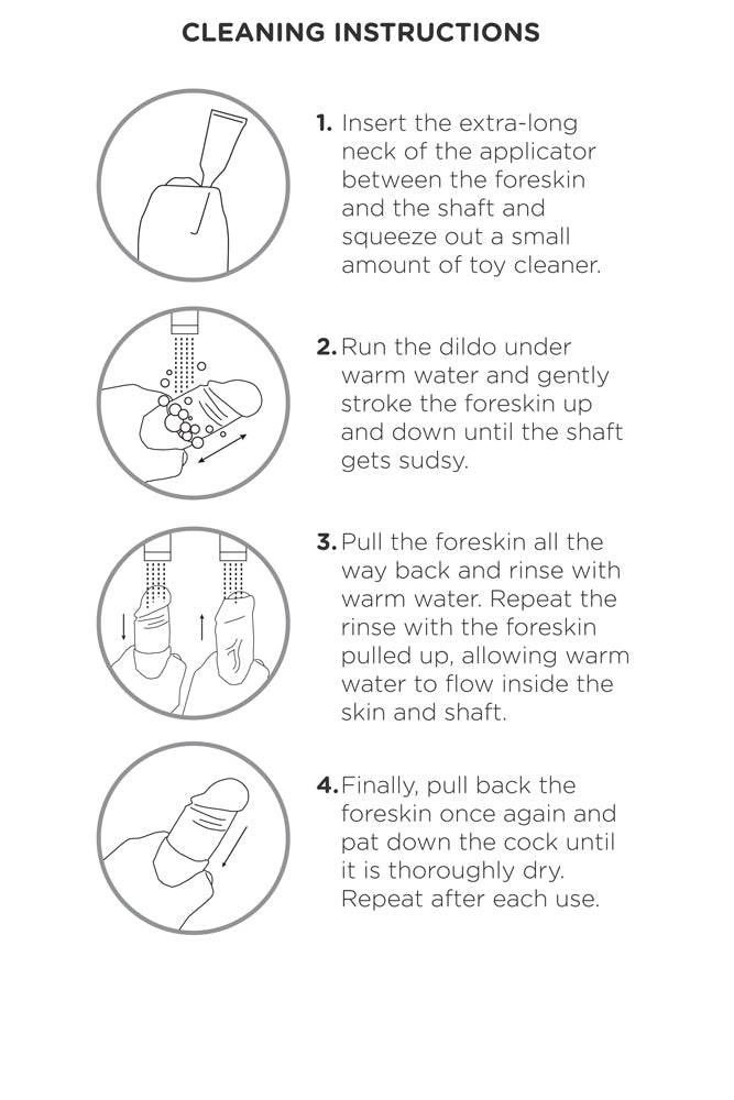 - *En raison de la nature particulière de ce produit, le prépuce nécessite une attention particulière lors du nettoyage. Utilisez un nettoyant pour sextoys et de l’eau tiède pour nettoyer soigneusement l’intérieur du prépuce