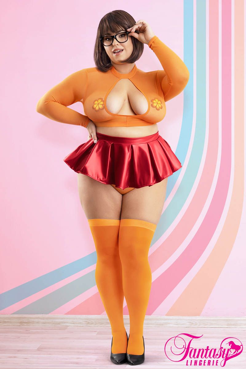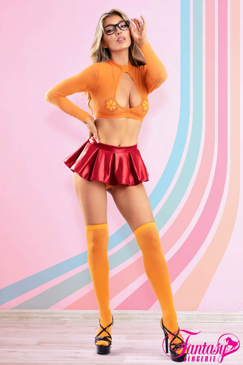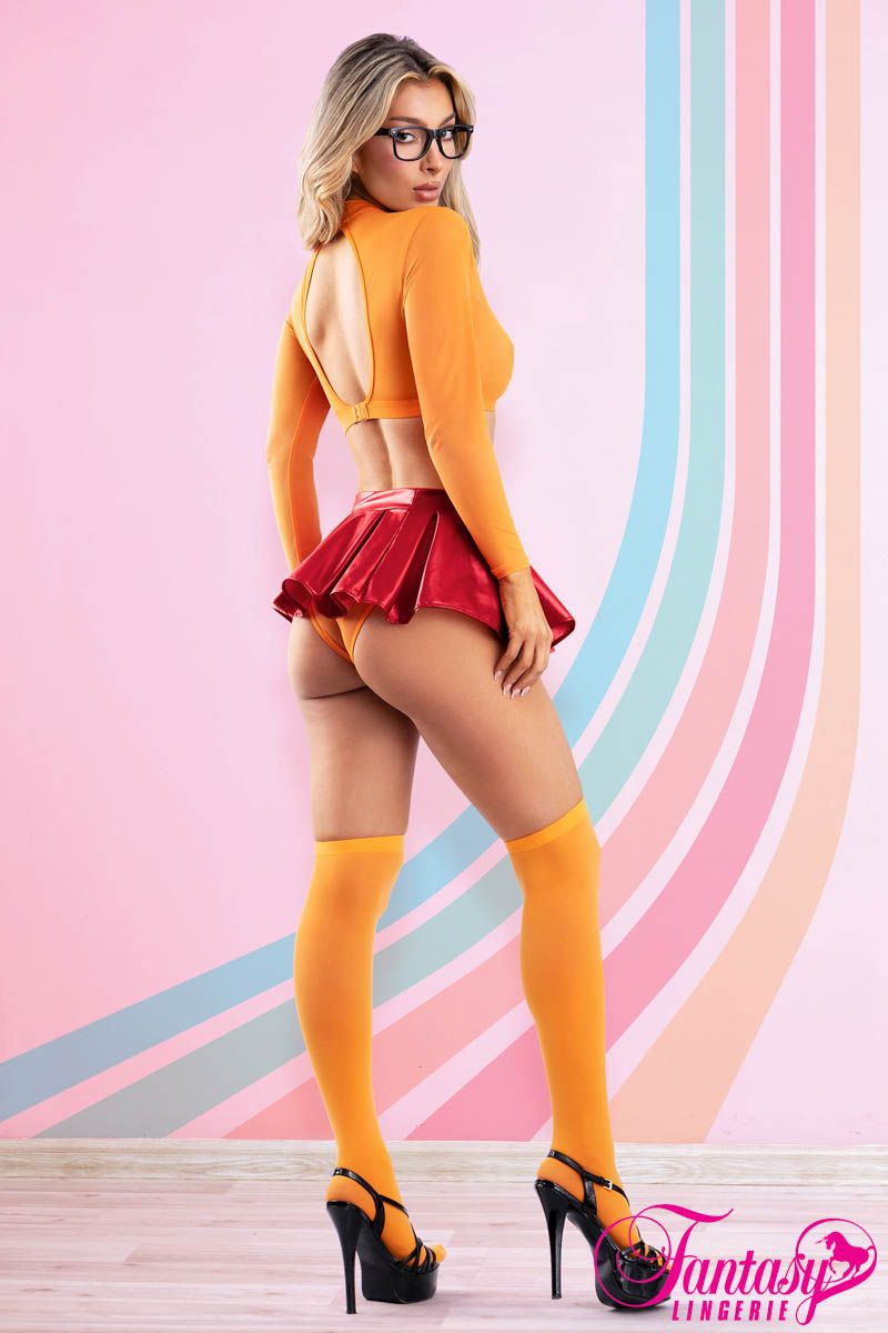 - Inclus : – Minijupe rouge wet look et lustrée avec une large taille – Bas orange avec une large bande opaque (2) – Pastilles en forme de fleurs retro (2) – Culotte en mesh semi-transparente – Lunettes en plastique noir